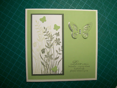 Butterflies are my favourite things to put on cards and I have several stamps and punches to use. The one I used today cuts the butterfly's wings but not the body. I have also used the Just Believe stamp set, the sentiment from Butterfly Prints and the colours Certain Celery and Always Artichoke.
