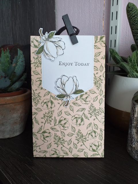 So the same DSP was used so that the card and bag match and the closure was made with one of the dies from the Stitched Nested Labels. Another image from the Good Morning Magnolia set was used to decorate it and I found a little peg in my stash to anchor it.